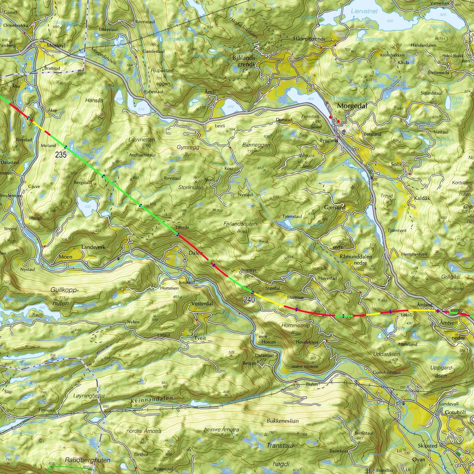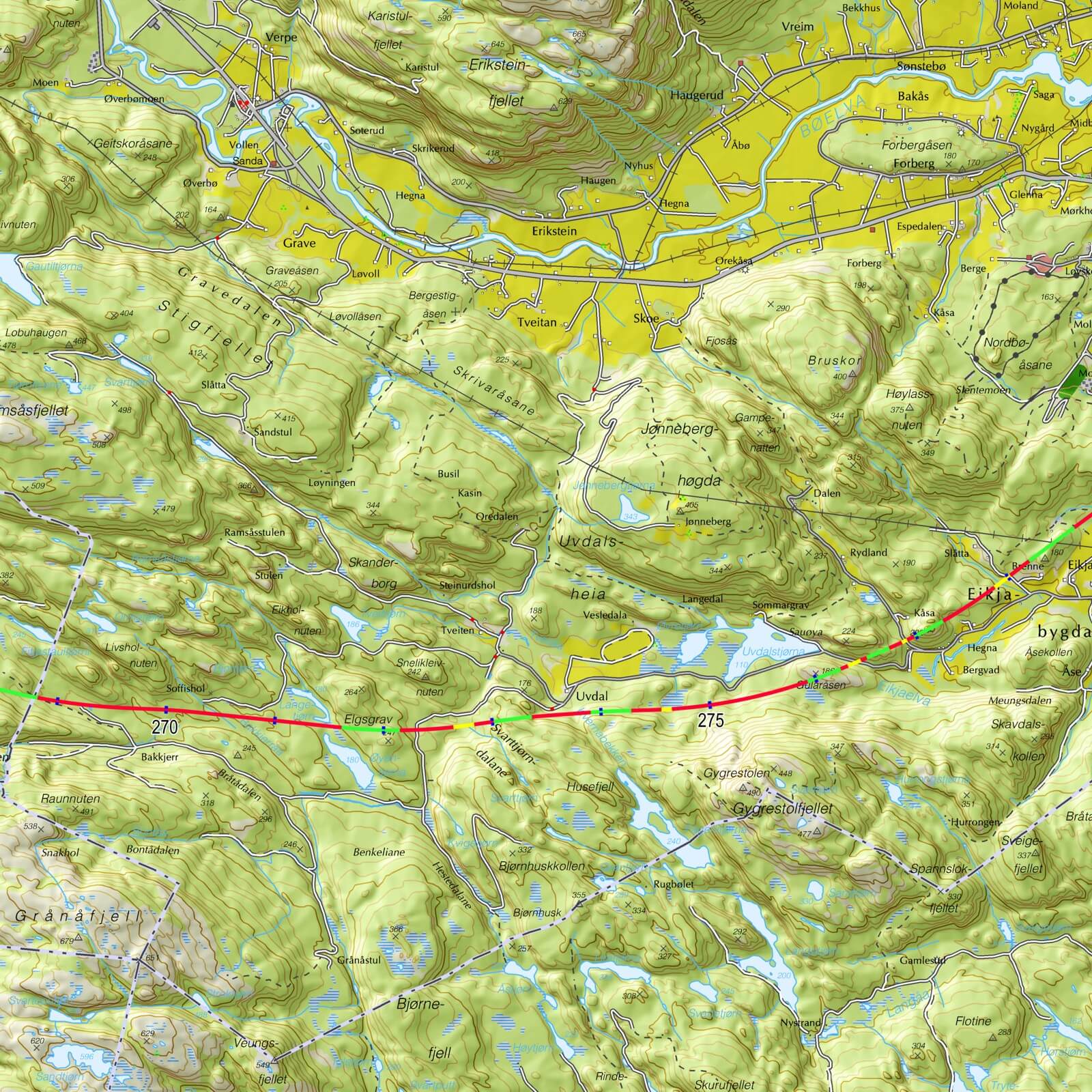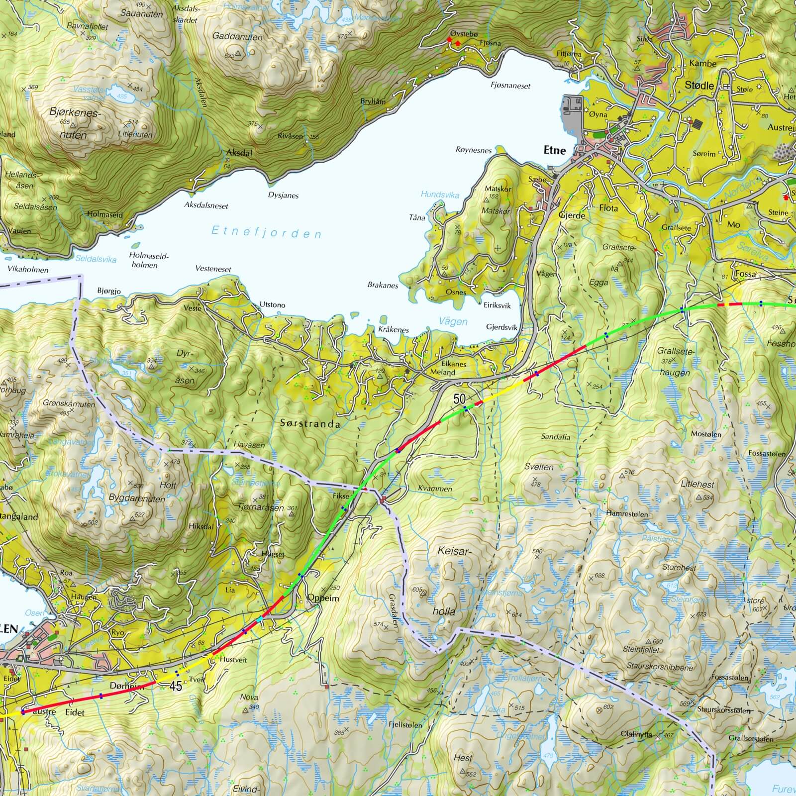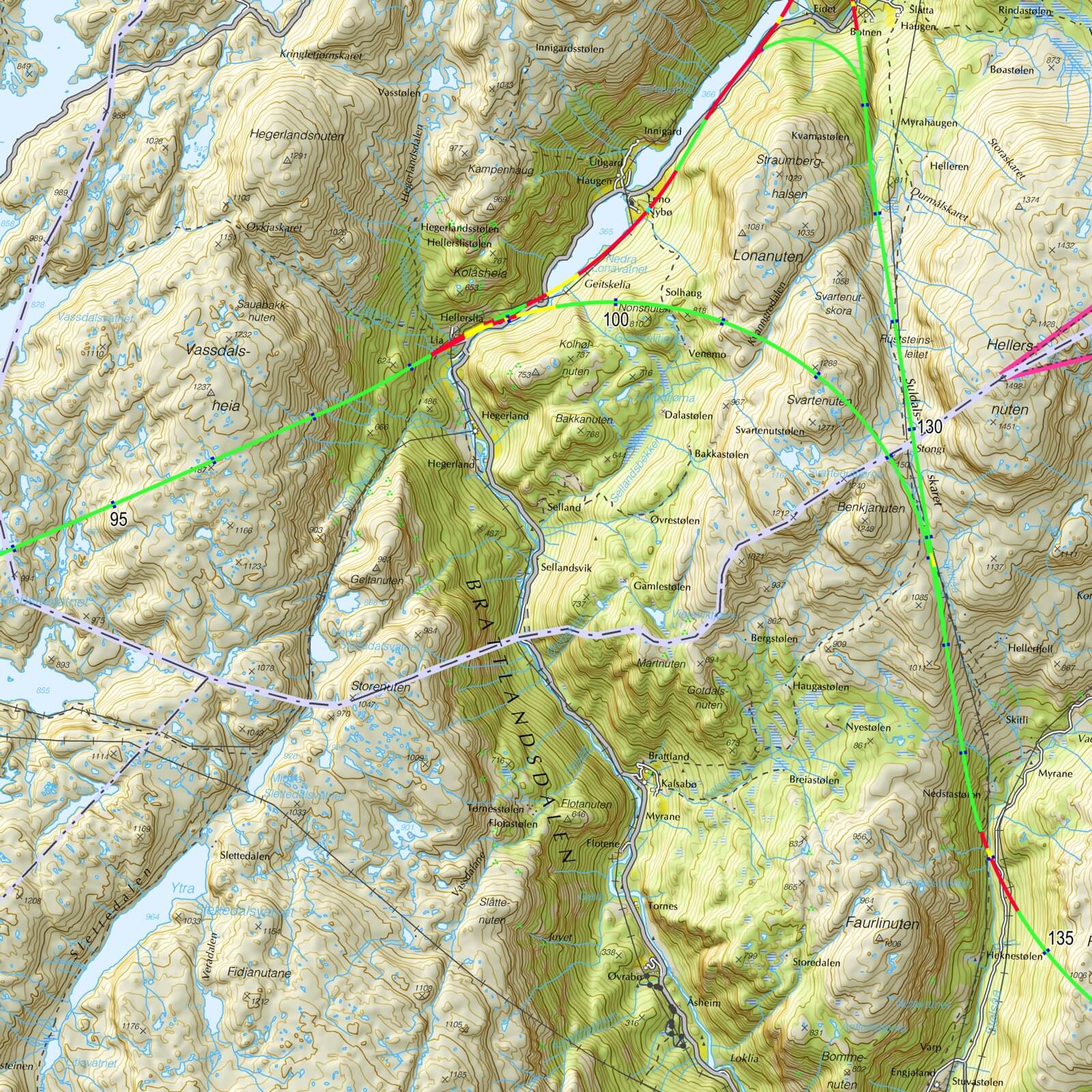 Vi publiserer no kart for heile traséen vest for Kongsberg. Karta er i målestokk 1 : 50 000, men traséframlegget er utarbeidd på kart i målestokk 1 : 1000 (1 : 5000 der meir detaljerte kart ikkje finst.)