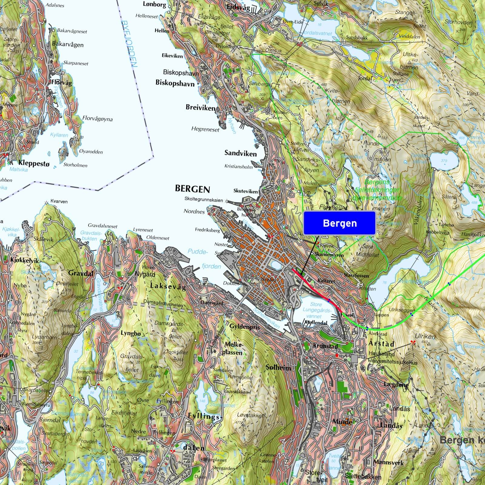 Dagstrekningar er innteikna i raudt, bruer i gult, fjelltunnelar i grønt, kulvertar (betongtunnelar) i cyan og overbygg i fiolett. Tunnelar og bruer som er mindre enn 25 m lange, er ikkje med på karta. Det er 1 km bane mellom blå markeringar. Tala som er oppgjevne med 5 km mellomrom, gjeld for banedistansen rekna frå Bergen (kart 1 - 15 og 33 - 55), Haugesund (kart 15 - 26) og Stavanger (kart 27 - 32). Kartutsnitta er på 10 km x 10 km. Kvar kartfil på ca. 1 MB eller mindre.